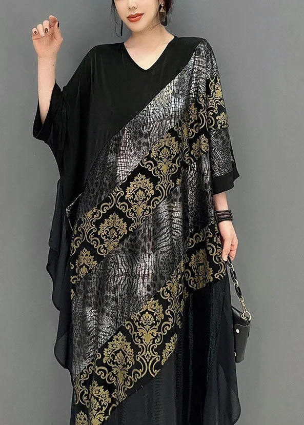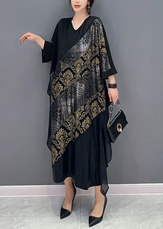 Classy Black V Neck Patchwork Ruffles Long Dresses Bracelet Sleeve