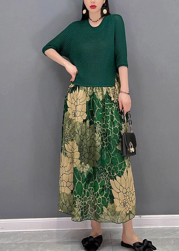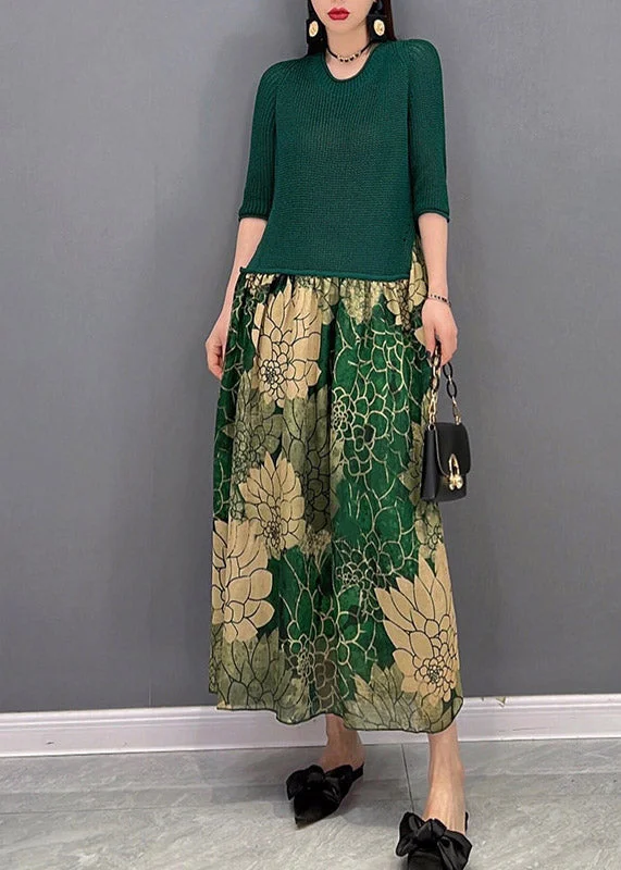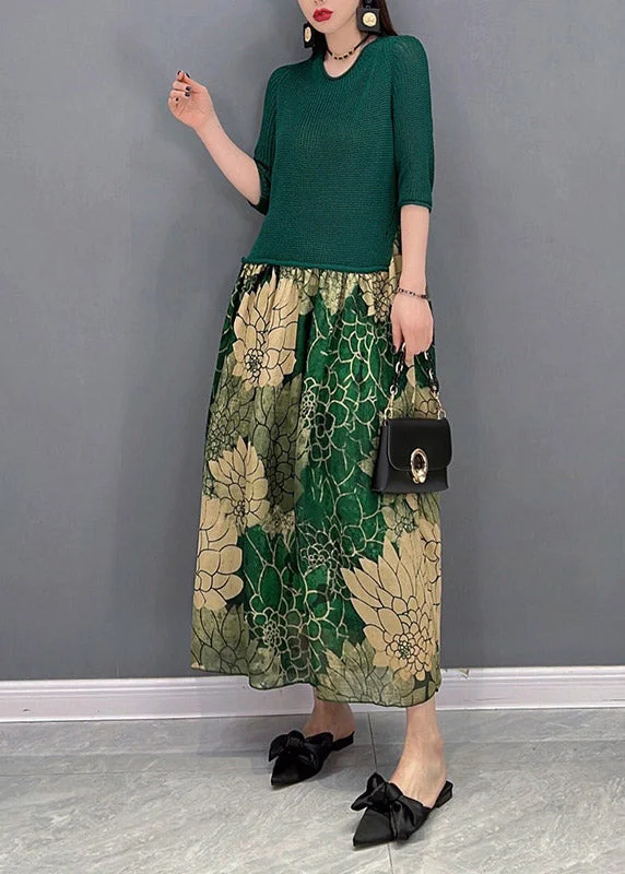 Fashion Green O-Neck Chiffon Patchwork Print Knit Long Dress Half Sleeve