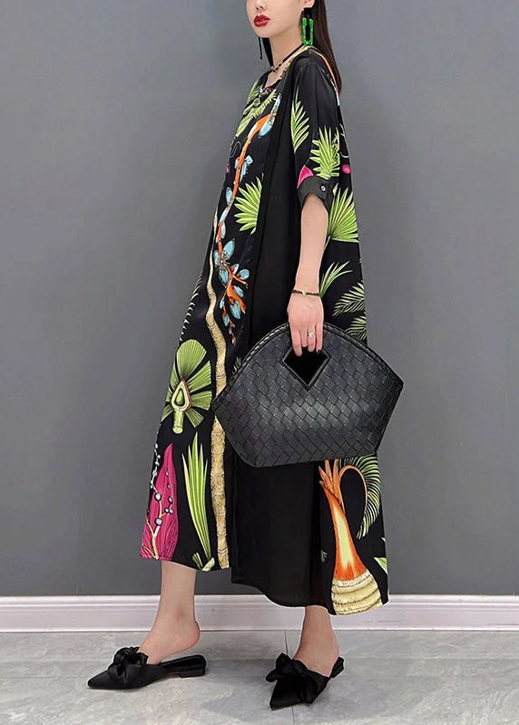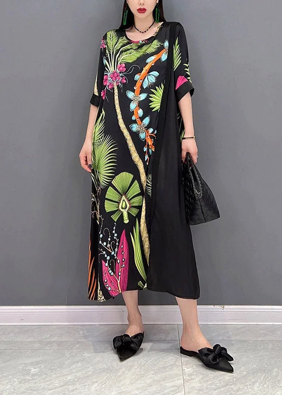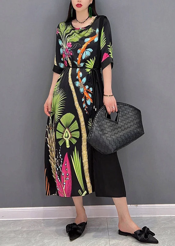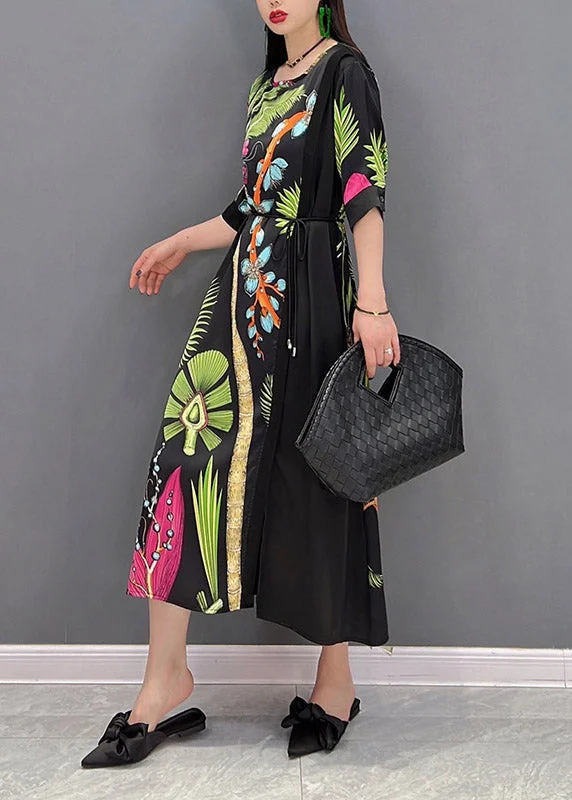 French O-Neck Print Patchwork Tie Waist Chiffon Dresses Half Sleeve