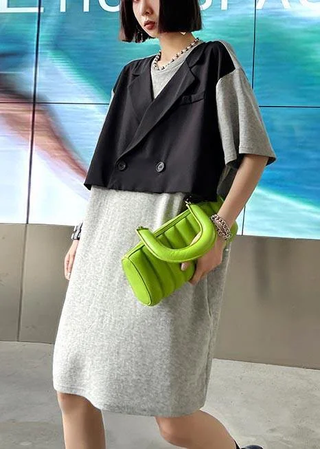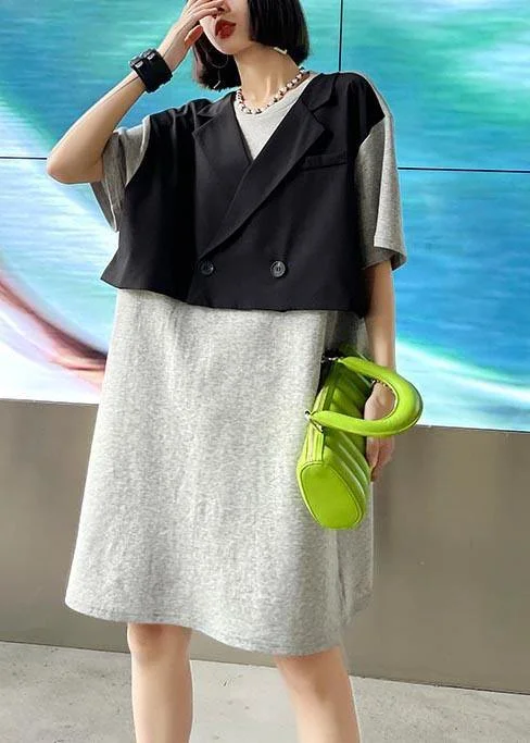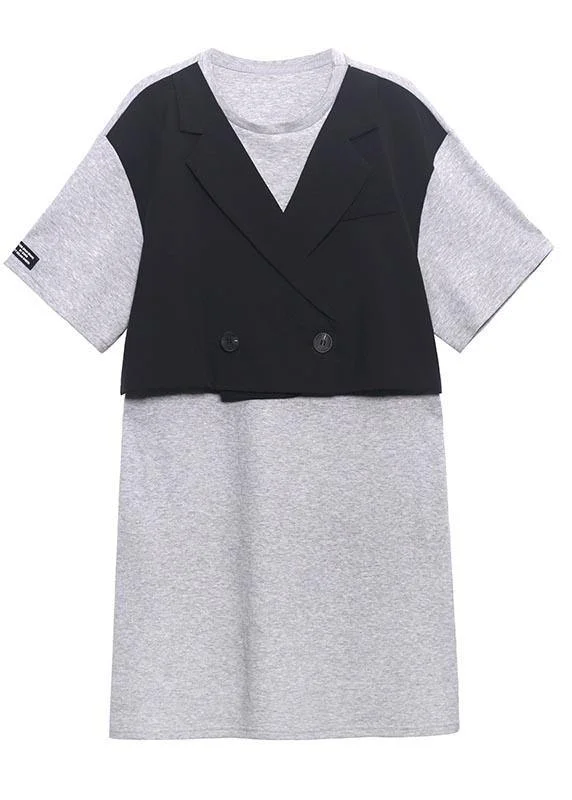 Unique Grey Patchwork Black Button Party Summer Cotton Dress