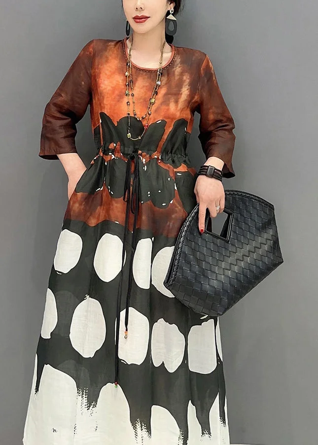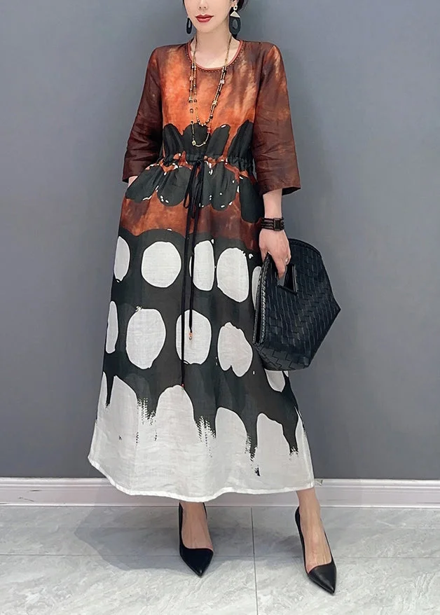 Vintage O-Neck Cinched Print Long Dress Bracelet Sleeve